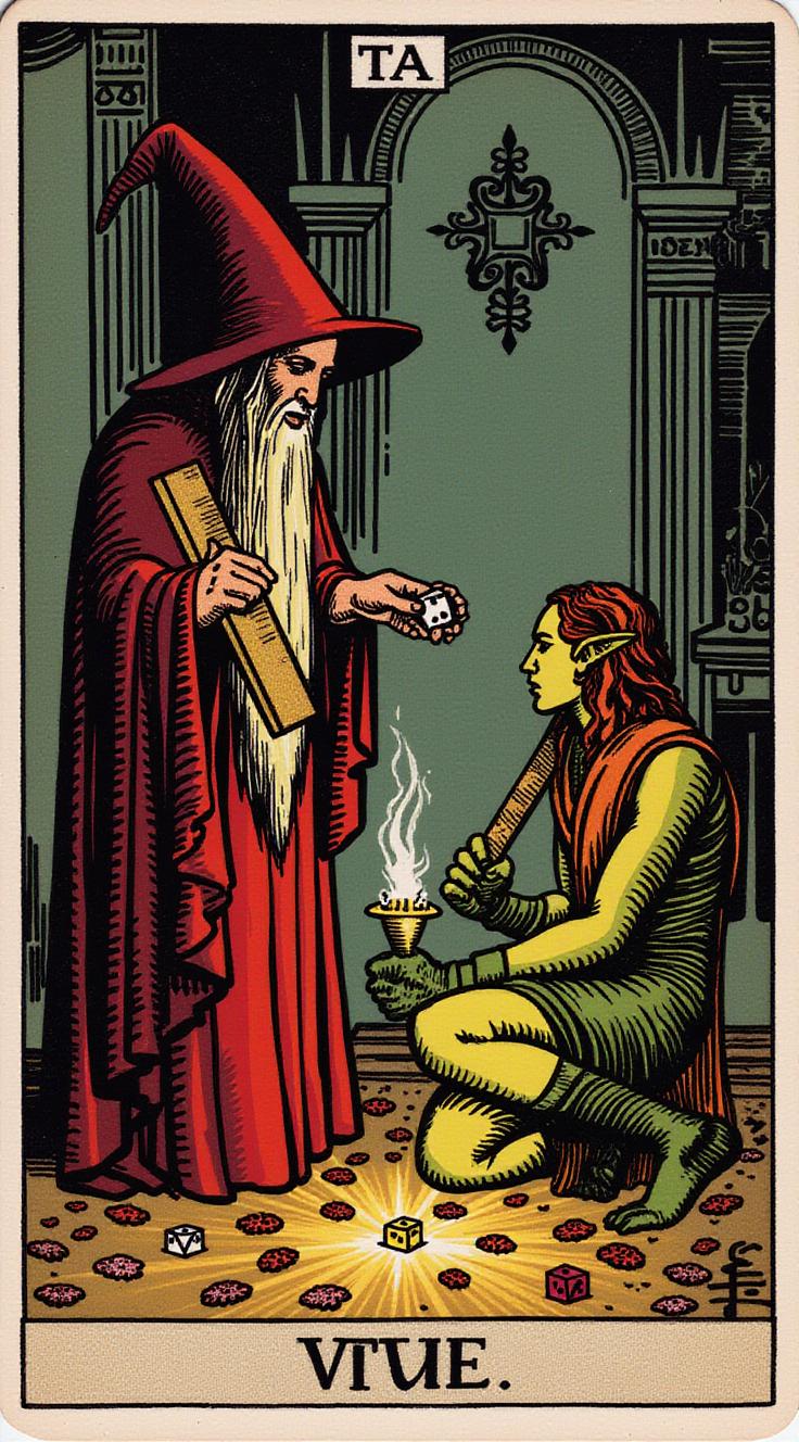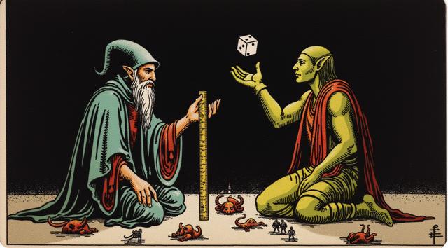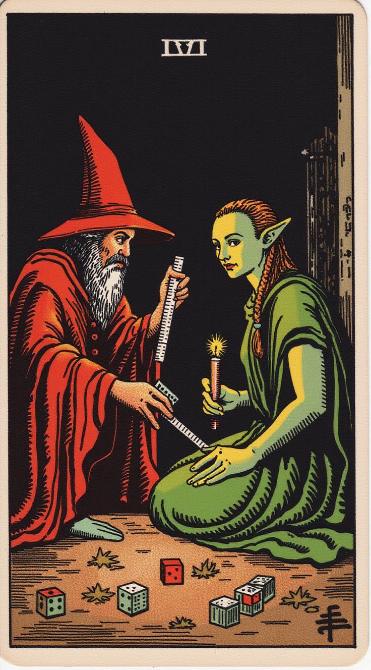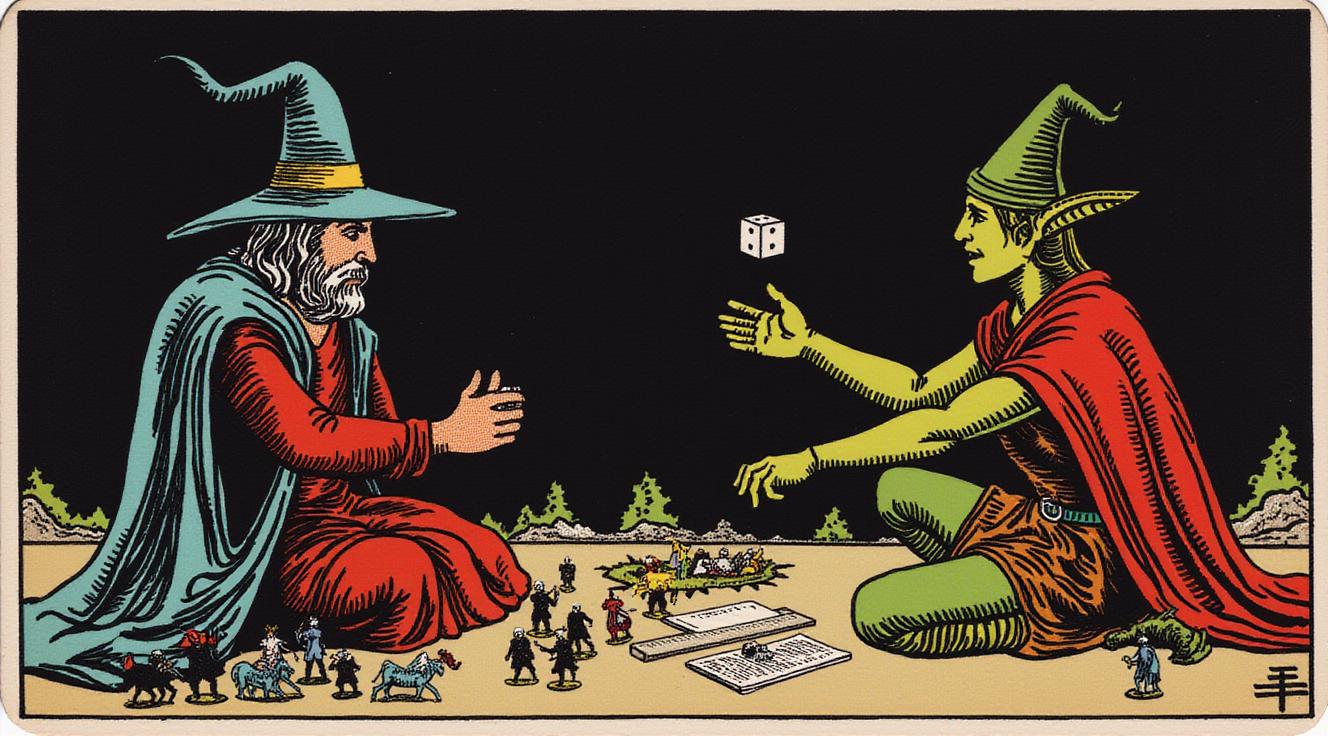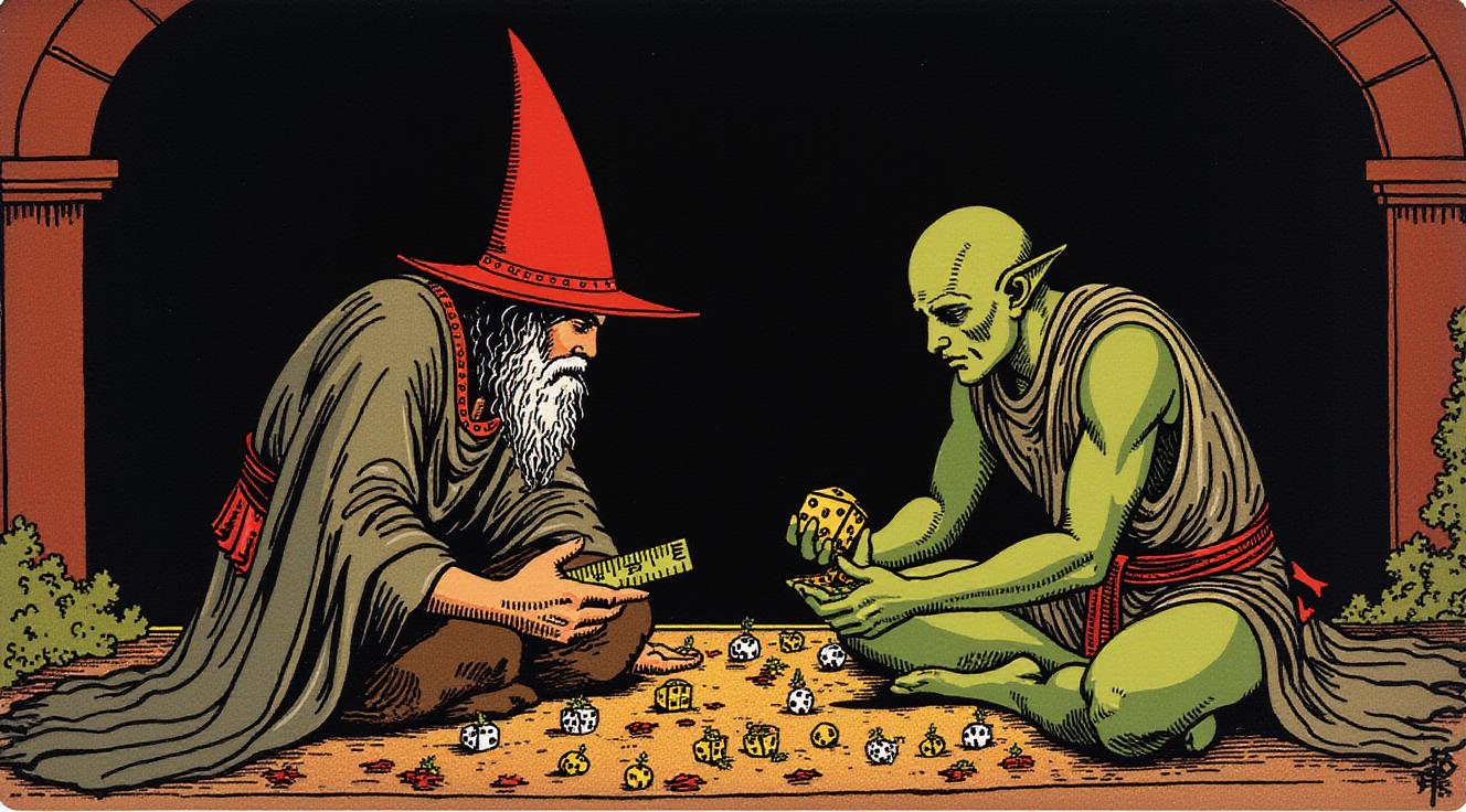dark background. on the left wizard and green skinned elf playing together on the floor in the light of a candle. one holding a ruler and another holding a dice. on the right of a picture demons are hiding it the darkness. lots of dices and tiny miniatures on the floor. upper side of a picture is dark and blank.