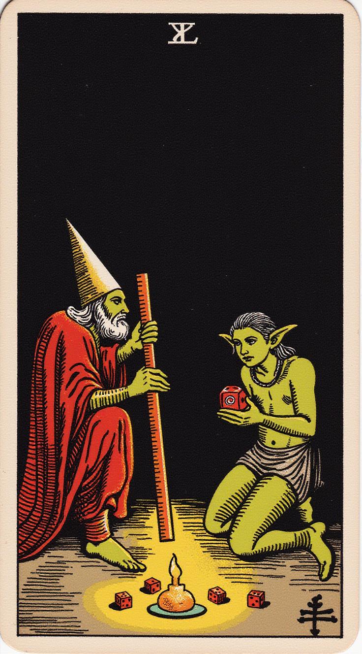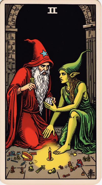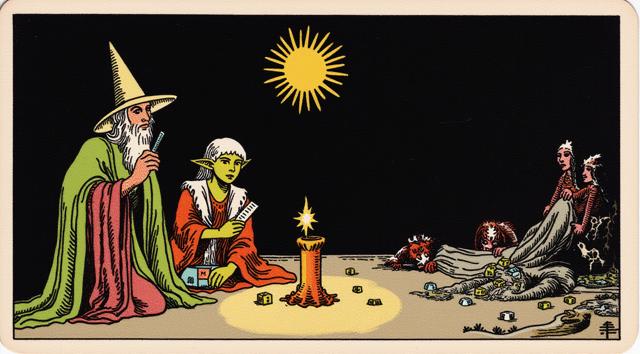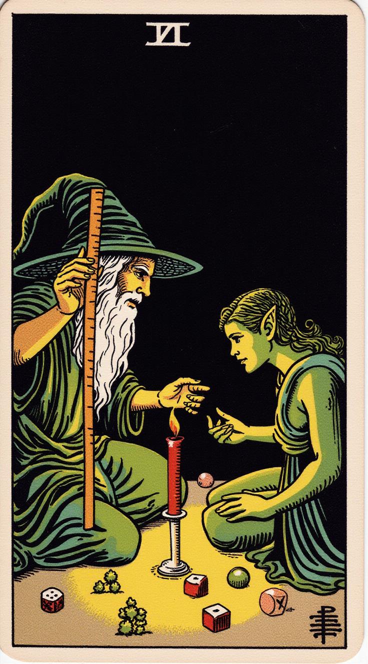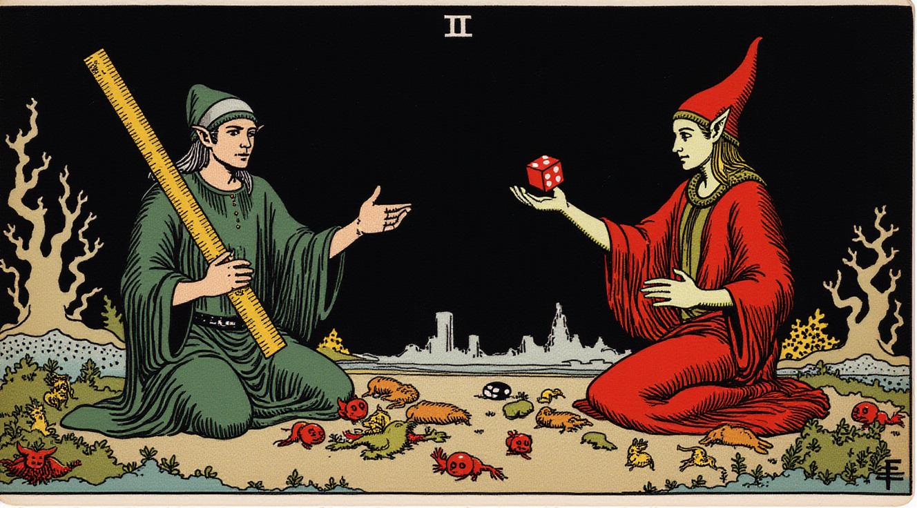 dark background. on the left wizard and green skinned elf playing together on the floor in the light of a candle. one holding a ruler and another holding a dice. on the right of a picture demons are hiding it the darkness. lots of dices and tiny miniatures on the floor. upper side of a picture is dark and blank.