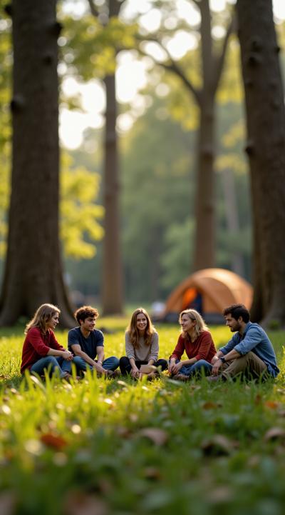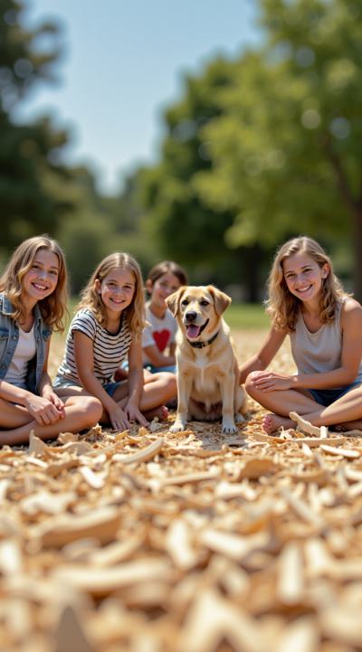 несколько детей возраста 10 и 12 лет сидящие на куче древесной стружки светлого цвета и играют с собакой. Они улыбаются и смотрит прямо в камеру. На заднем плане видны зелёные деревья и голубое небо, создающие ощущение летнего дня. Дети одеты в лёгкую одежду, что подчёркивает их расслабленное и радостное настроение.,