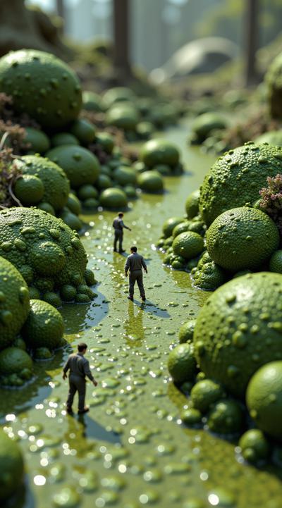 Представь фантастический инопланетный ландшафт: зелёная поверхность, покрытая загадочными округлыми наростами разного размера. Наросты выглядят объёмными и шероховатыми, словно древние организмы, застывшие во времени. Поверхность между наростами волнообразная, с тонкими линиями, напоминающими древние руны или следы движения. Цветовая гамма — насыщенные зелёные тона с контрастными тёмными пятнами. Создай атмосферу таинственности и неизведанности, будто зритель смотрит на чужую планету через микроскоп