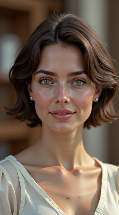 "Женщина-андроид, выглядящая как милая, молодая девушка с именем София Александровна Смирнова. У неё умные, но добрые глаза, мягкое освещение, короткие или средней длины волосы, современный, элегантный, но неброский стиль. Атмосфера: спокойствие и мудрость. Качество: фотореалистичное, высокий уровень детализации.",
