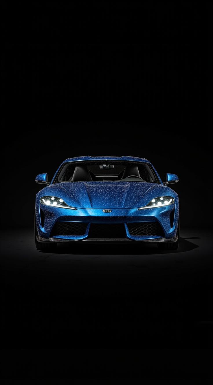 молодая женщина, сидящая в дверце спортивного автомобиля с открытыми «ножничными» дверями. Автомобиль ярко-синего цвета, с видимыми деталями: крупные колёса, оранжевые тормозные суппорты, стильный интерьер. Женщина одета в короткое чёрное платье, на ней туфли на высоком каблуке с леопардовым принтом. Она позирует, слегка наклонившись вперёд, одна рука лежит на дверце машины, другая — на колене. Её поза расслабленная, но выразительная, взгляд направлен в сторону. Фон размытый, индустриальный — видны конструкции, напоминающие элементы завода или склада, небо затянуто облаками. Освещение мягкое, с тёплым оттенком, создающим атмосферу заката или раннего утра.