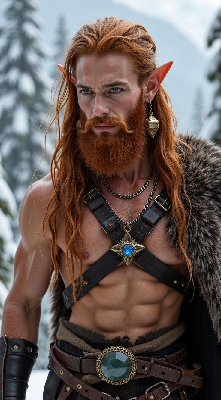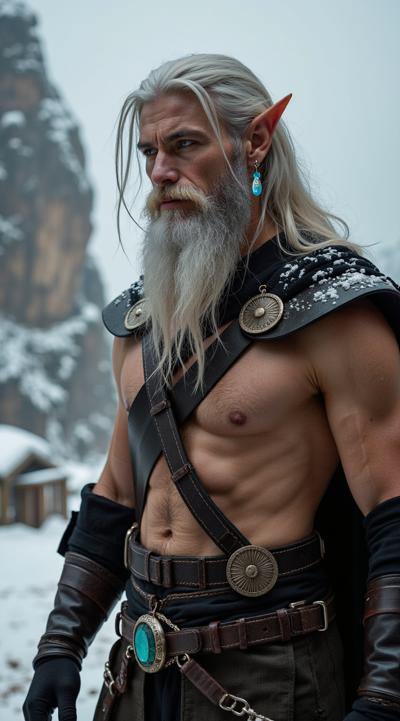 Full height. Young shapely handsome elf, with long blonde hair and hoary beard. Shirtless, black hairy chest. Tanned skin with a bronze tint. Smokey makeup. Dressed in a fur cape and silver crown. Silver earrings and nipple piercings with bright stones. Chain spiked collar on neck. Surrounded by winter mountain