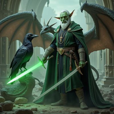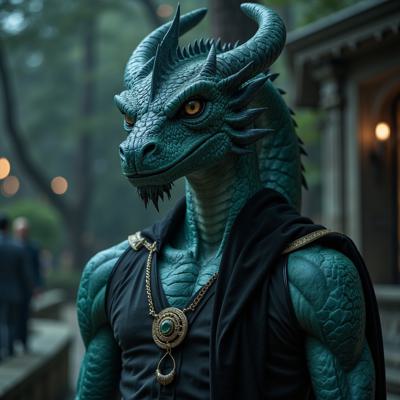 ысокий мужчина с ярко выраженными чертами дракона, представляющий собой гармоничное сочетание человеческой силы и благородства древней природы. Его кожа окрашена глубокими оттенками тёмно-бирюзового цвета, переходящего местами в почти чёрные тона, придавая образу суровую таинственность и величие. Глаза сверкают золотом, отражая мудрость и древнюю связь с природой., , Его длинные волосы густые и спутанные, часто украшенные веточками и травинками, словно дар леса. Просторная мантия зелёного оттенка плотно прилегает к телу, подчёркивая мощь и элегантность фигуры. Повсюду заметна характерная чешуйчатость кожи, придающая ему сходство с легендарными существами древности.