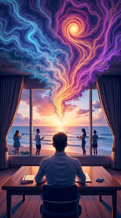 Психоделическая книжная иллюстрация в стиле нейрографики. Мужчина за столом пишет в тетради «Глава 44». От его головы расходятся разноцветные волны-спирали глубокого синего, фиолетового и золотого. Три женских силуэта растворяются в пульсирующих оранжево-розовых вихрях. Окно с морем искажено текучими линиями. Цвета: индиго для глубины, янтарь для тепла, бирюза для гипнотического эффекта. Мягкое свечение, плавные переходы, завораживающая перспектива, успокаивающая динамика. Атмосфера транса и погружения. в стиле киберпанк 2077,