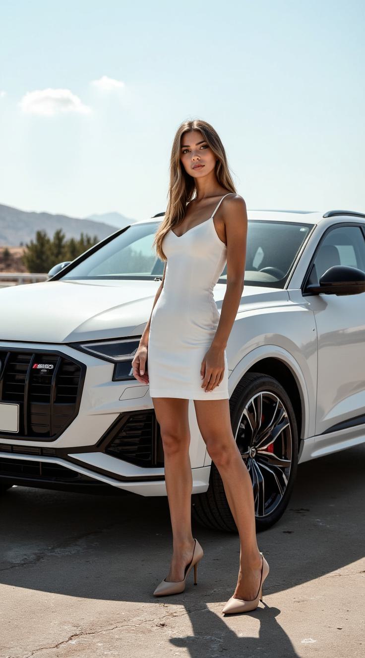 реализм, молодая женщина в белом облегающем платье и бежевых туфлях на высоком каблуке, позирующую рядом с Audi RS Q8 SUV. Ракурс кадра полубоковой (фронтально с небольшим поворотом вправо), чтобы были видны аэродинамические линии кузова, фары и воздухозаборники автомобиля. Фон: открытое пространство с асфальтовым покрытием, на заднем плане другие спортивные автомобили, шатры, море и береговая линия. Освещение — яркое дневное, солнечное, с чёткими тенями и бликами на кузове машины. Атмосфера — праздничная, как на автошоу. Качество изображения — высокое, с детализацией текстур (лак на кузове, ткань платья). Композиция сбалансирована, акцент на взаимодействии модели и автомобиля.
