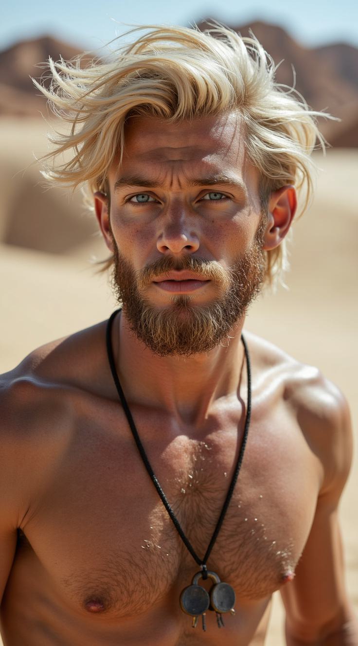Стройный молодой парень эльф в полный рост. В футуристическом стиле Дюны Дени Вильнёва. Похож на Фейд-Рауту Харконнеа из Дюны. Глаза неестественного яркого синего цвета. Красивое лицо с высокими скулами. Волосы блонд, уложены в сложную причёску. Борода очень длинная светлая. Без рубашки, мускулистая волосатая грудь. На шее и в ушах украшения с драгоценными камнями, висит цепь с кулоном. Окружение пустыня.