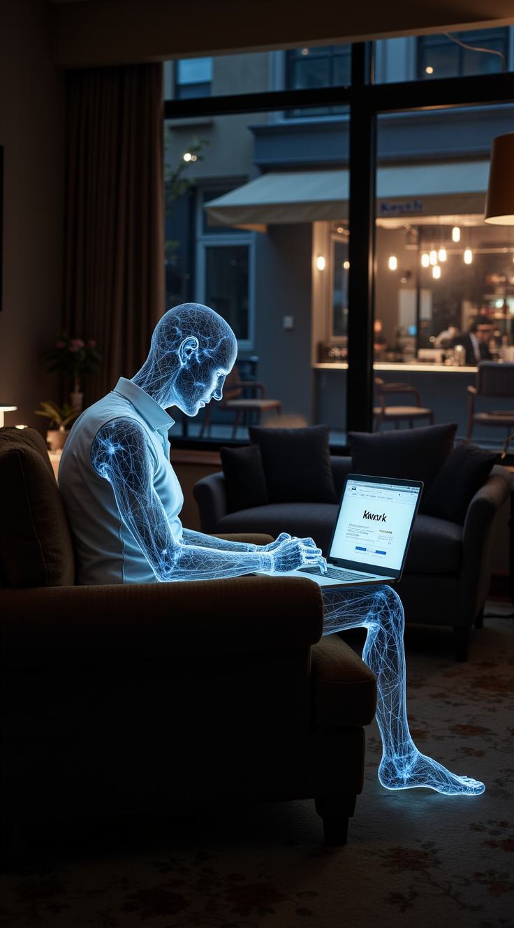 Человек сидит в потертом кресле перед ноутбуком. Его тело полупрозрачное и светится тусклым светом разряженной батареи. Токи текут от пальцев в клавиатуру, в экран с вкладками WorkZilla и Kwork. Комната темная, на столе остывшая чашка чая. Но через окно видна уютная кофейня с теплым светом. На переднем плане — рука с телефоном, на экране открыт живой отзыв на Яндекс Картах. Стиль: сюрреалистичная цифровая графика с элементами киберпанка. Высокий контраст. Выражение лица — усталое, но в глазах искра осознания.