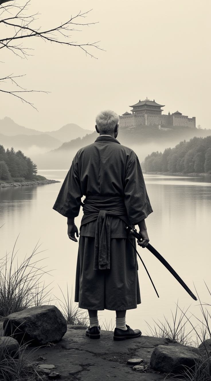 Книжная обложка в стиле японской гравюры. Пожилой самурай в простой одежде стоит на берегу широкой реки, спиной к зрителю. За его спиной на горизонте виднеется темный неприступный замок, окутанный туманом. Перед ним — река, отражающая рассветное небо, гладкая и спокойная. На переднем плане — камни на берегу, трава. Цвета: приглушенная охра, индиго, серый, золотистый рассветный свет. Мягкий туман, атмосфера покоя и внутренней силы. Минималистичный шрифт, японская каллиграфия. с нотками хакерства и киберпанка в Санкт-Петербурге,