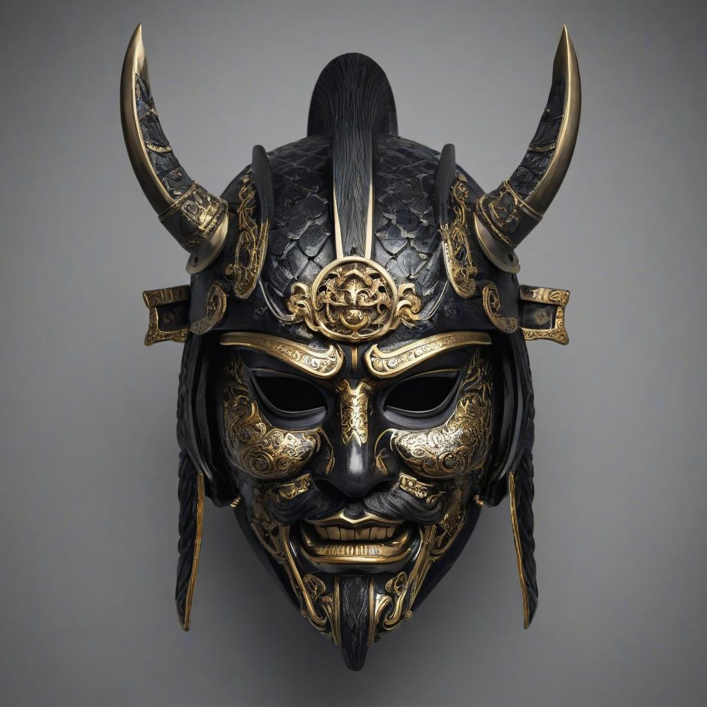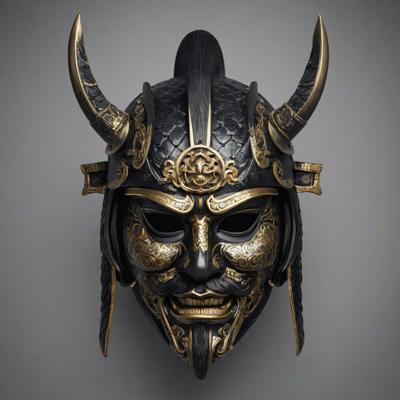 Create a hyper-realistic image of a Japanese samurai mask in a rough style, rendered in black and white tones with gold accents. The mask should convey a sense of strength and nobility, reflecting the rich culture of the samurai. Pay attention to details such as facial expression, texture, and elements of traditional Japanese design. The background should be minimalist to emphasize the mask.