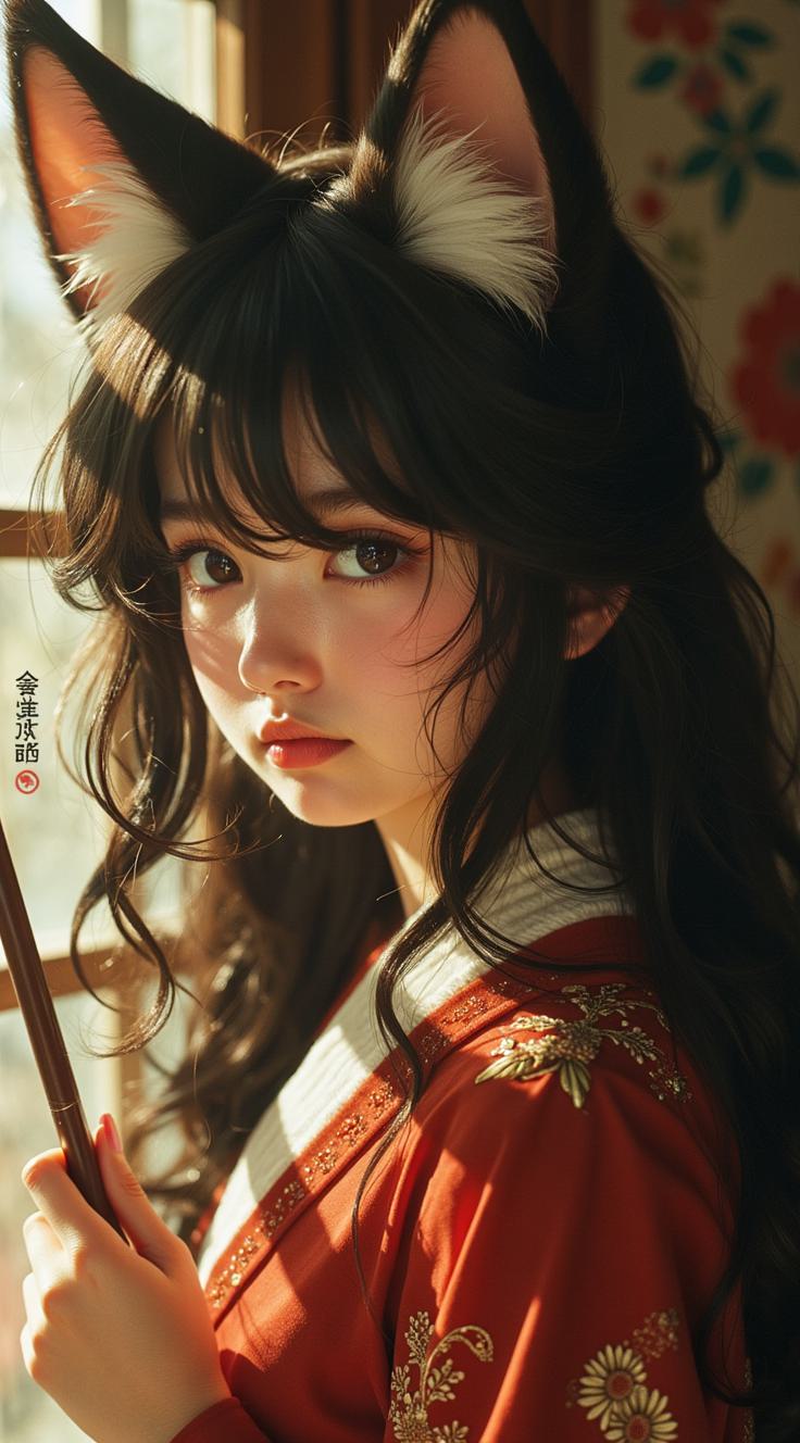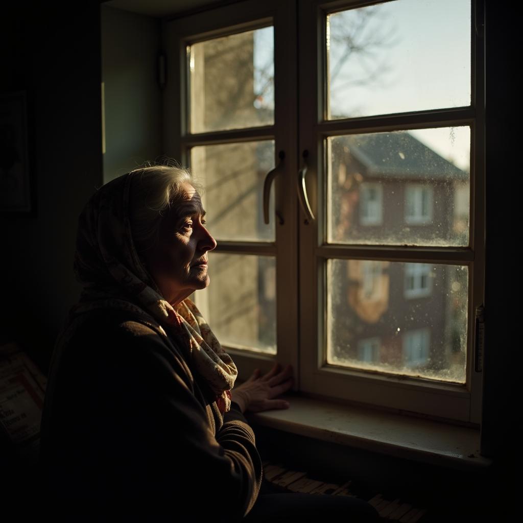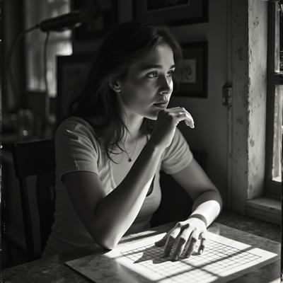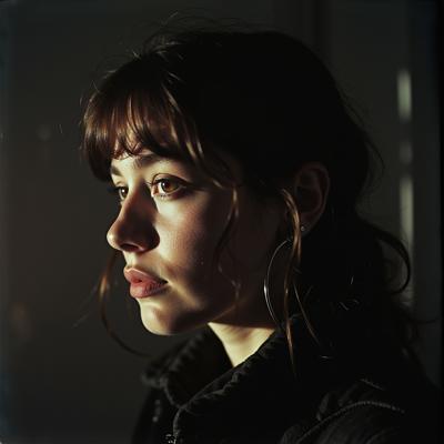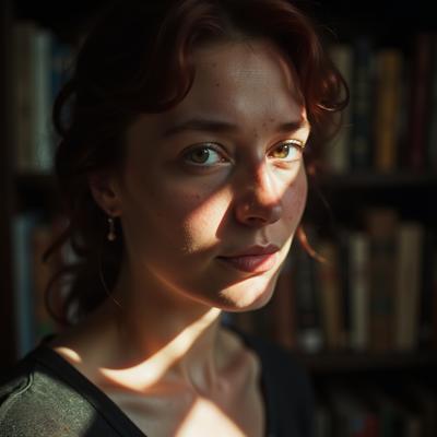 Портрет по пояс или по плечи. Женщина 30 лет с умным, спокойным, немного отстранённым взглядом. Темные волосы в рыжину. Немного морщин. Веснушки на лбу и щеках. Уверенность без надменности. Легкая, едва заметная улыбка в уголках губ, будто она знает интересный секрет. Фон размыт, но угадываются книжные полки или столик кафе с ноутбуком. Свет мягкий, боковой, подчеркивающий черты лица. Ничего кричащего, только качественные текстуры (кашемир, дерево, бумага).