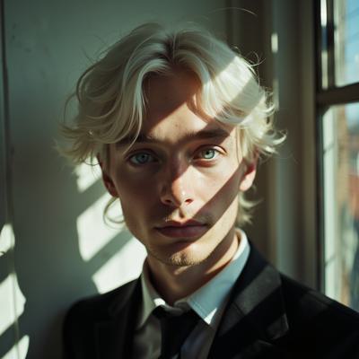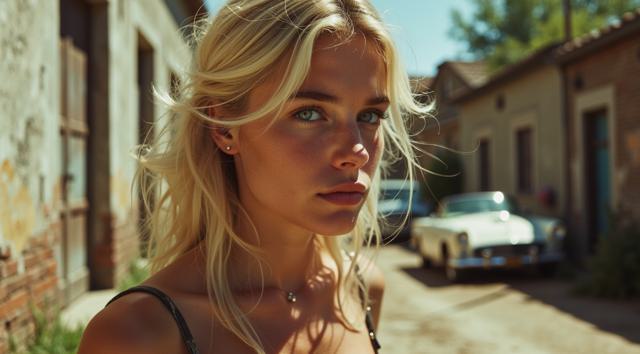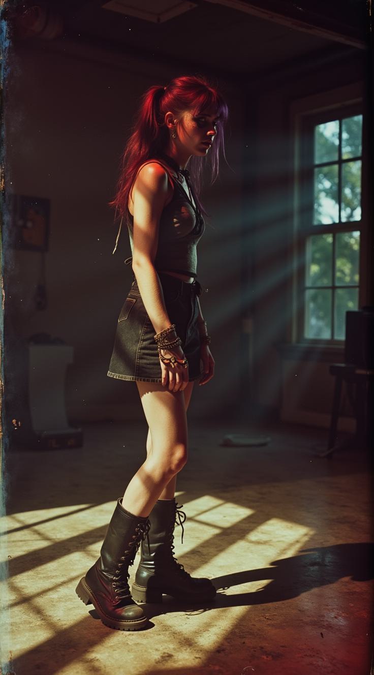 Реалистичное фото, утро после дикого панк-концерта в старом ДК. На пустой сцене стоит молодая альтушка, едва держится на ногах, пошатывается. Грязные красно-фиолетовые волосы спутны, на лице «шлюший» макияж: жирная черная подводка размазана до ушей, помада размазана. Она в тяжелых стоптанных берцах, рваных колготках и помятой мини-юбке. Вид экстремально неопрятный, потный и помятый. Вокруг пустые банки, окурки, провода и мусор. Тусклый свет из пыльных окон, в воздухе висит дымка. Атмосфера маргинального андерграунда, эстетика «грязного реализма», эффект снимка на старую мыльницу, зернистость, вспышка в лоб, суровый русский панк-рок вайб