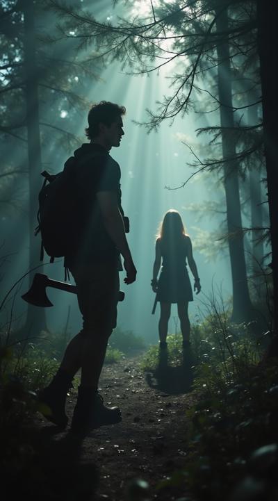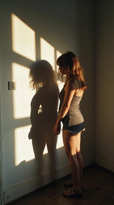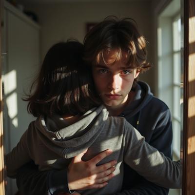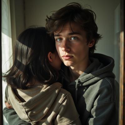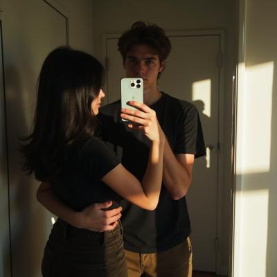 Парень делает фото в зеркале. Ему 17 лет, коричневые волосы средней длины, серые глаза. Он в черной футболке и коричневых шортах по колено. Одной рукой держит телефон, через готорый фотографируется (его видно в зеркале), а другой рукой обнимает девушку. Она стоит спиной к зеркалу. У нее черные волосы по лопатки. Одета в толстовку и широкие джинсы. Они стоят в коридоре с приглушенным светом