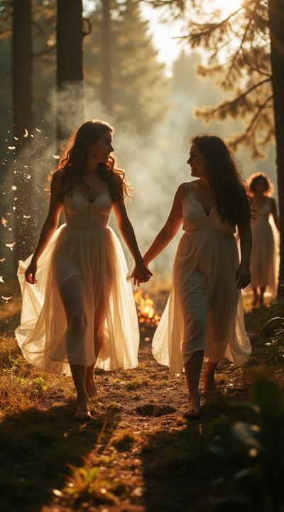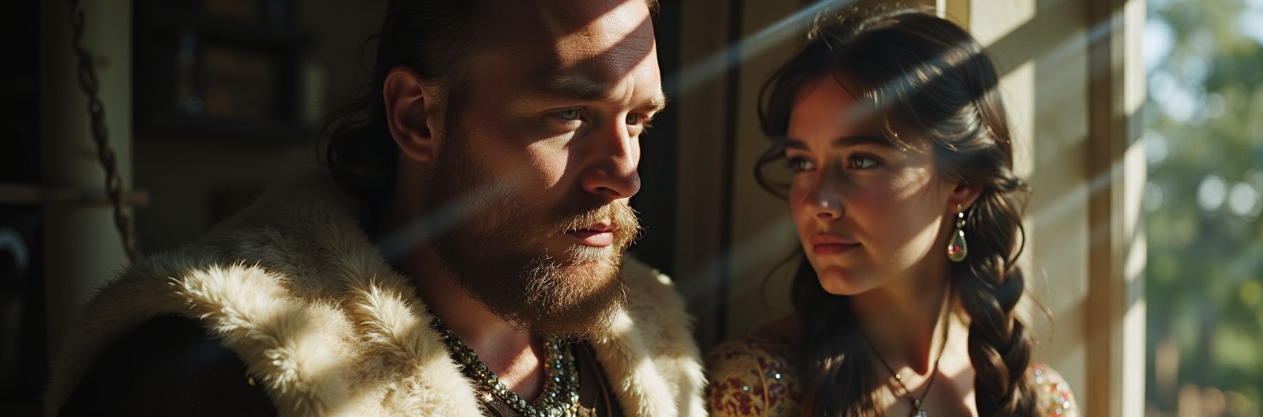 мужчина, викинг Рагнар Лодброк, крепкое телосложение, борода средней длинны, стрижка под ноль, богатая свадебная светлая скандинавская одежда, на плечах плащ из ткани, украшения из драгоценных металлов и природных камней, девушка, свадебная скандинавская одежда, темные волосы собраны длинную косу из густых волос, в волосы вплетены украшения, оба держатся за руки, нежность, церемония заключения брака, стоят перед жрецом, арка из дерева цветов лент, по обе стороны толпа гостей, локация туманный лес, ранняя осень, легкий ветер, полный рост, общий план, вид из далека