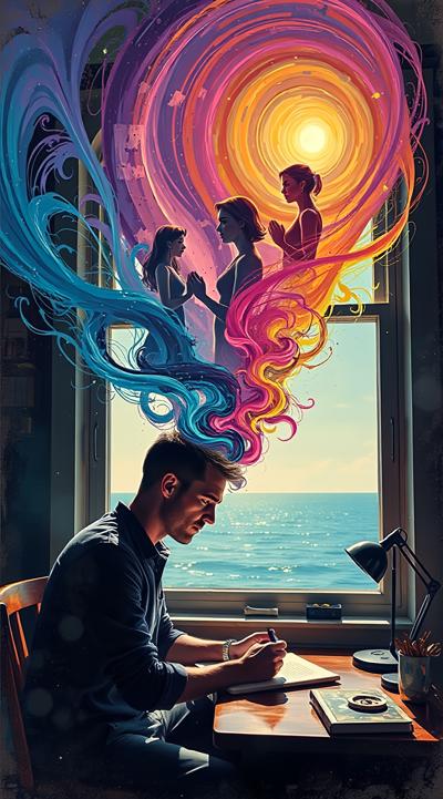 Психоделическая книжная иллюстрация в стиле нейрографики. Мужчина за столом пишет в тетради «Глава 44». От его головы расходятся разноцветные волны-спирали глубокого синего, фиолетового и золотого. Три женских силуэта растворяются в пульсирующих оранжево-розовых вихрях. Окно с морем искажено текучими линиями. Цвета: индиго для глубины, янтарь для тепла, бирюза для гипнотического эффекта. Мягкое свечение, плавные переходы, завораживающая перспектива, успокаивающая динамика. Атмосфера транса и погружения.