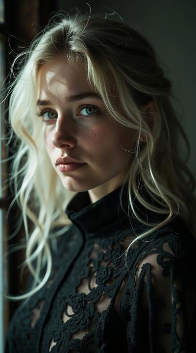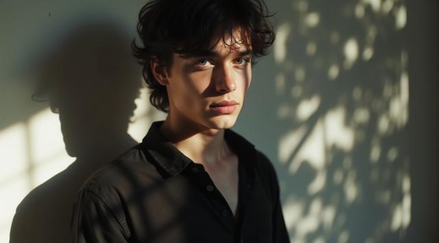 молодой парень. модельной внешности .прямой аккуратный нос.острые черты лица пухлые губы бледная кожа худоватого телосложения черные волосы волнистые растрепаные чуть покрывают уши дымчато-серые глаза черная рубашка с растегнутым верхом рубашка перетянута карсетом на талии штаны по типу джогеров тоже черные на ногах высокие ботинки. сидит на полу во круг летают вороны. модельная поза. отенки преолают темные серые.атмосфера мрачная