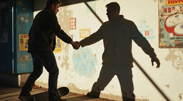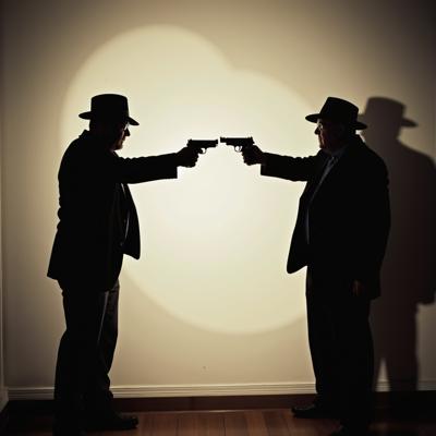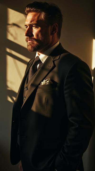 Мужчина в классическом костюме, красивый с бородой, выходит из тени,по всей видимости он очень важный, Он не помнит слово "да" и слово "нет", он не помнит ни чинов, ни имен., И способен дотянуться до звезд, не считая, что это сон,, И упасть, опаленным Звездой по имени Солнце..., Стоит В полный рост,у кобуре пистолет,на голове кепка восьмиклинка,