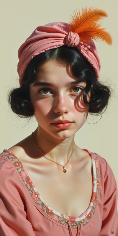 This is a digital painting in a realistic style, depicting a young woman with pale skin and delicate features, sitting against a plain, light beige background. She wears a pink, intricately patterned headscarf with an orange feather peeking out, and black, vintage-style bobbed hair. Her attire includes a translucent, floral-embroidered shawl over a green, satin-like dress, and she is adorned with long, dangling silver earrings and a long necklace with pendants. Her expression is calm and contemplative, with slightly parted lips and dark, almond-shaped eyes. The word "VOGUE" in bold, red capital letters is displayed at the top of the image.