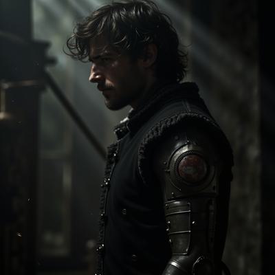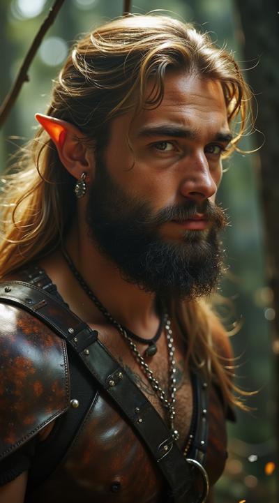 Full height. baldur's gate 3 style. Young slim handsome elf, with long gold hair with long black beard like dwarf. Shirtless and hairy chest. Tanned skin with a bronze tint. Smokey makeup. Dressed in leather armor. Silver earrings and piercings with bright gems. Chain collared on neck. Surrounded by winter mountain