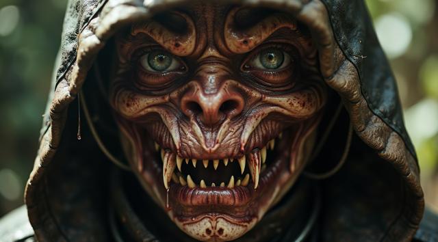 Photorealistic close-up of a living cloak. The material is a hybrid of ancient, weathered leather and biological tissue. Multiple realistic, wet animal eyes look in different directions. Several mouths with razor-sharp teeth gnash and drool viscous fluid. The cloak moves with a life of its own, sharp spines protrude from its back. Studio lighting, dark background, hyperrealistic, 8k, detailed texture, horror atmosphere, featured in a high-budget dark fantasy film