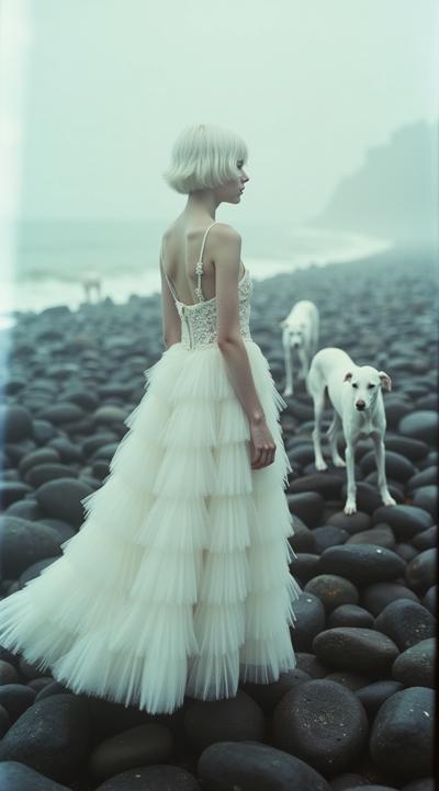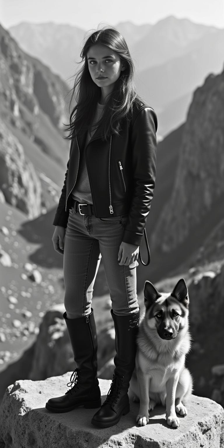 На черно-белой фотографии изображена молодая женщина шатенка с длинными волосами,сероглазая, одетая в черную кожаную куртку и джинсы, а также высокие ботинки. Она стоит на скале, рядом с ней находится собака породы малинуа . Фон изображения представляет собой горный пейзаж с серыми скалами и облачным небом., реалистично, крупным планом, профессиональное фото, 32 k, высокое разрешение, высокая детализация, 30mm lens, 1/250s, f/2.8, ISO 100, мягкое освещение