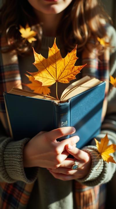 Крупный план. Женские руки прижимают к себе книгу в синем переплете, из книги торчат осенние желтые и оранжевые листья. Девушка одета в свитер и на нее накинут плед. Вокруг парят осенние листья. Атмосфера осени и октября. Книга в синем переплете, вокруг осенние желтые и оранжевые листья. Уют, плед, осень