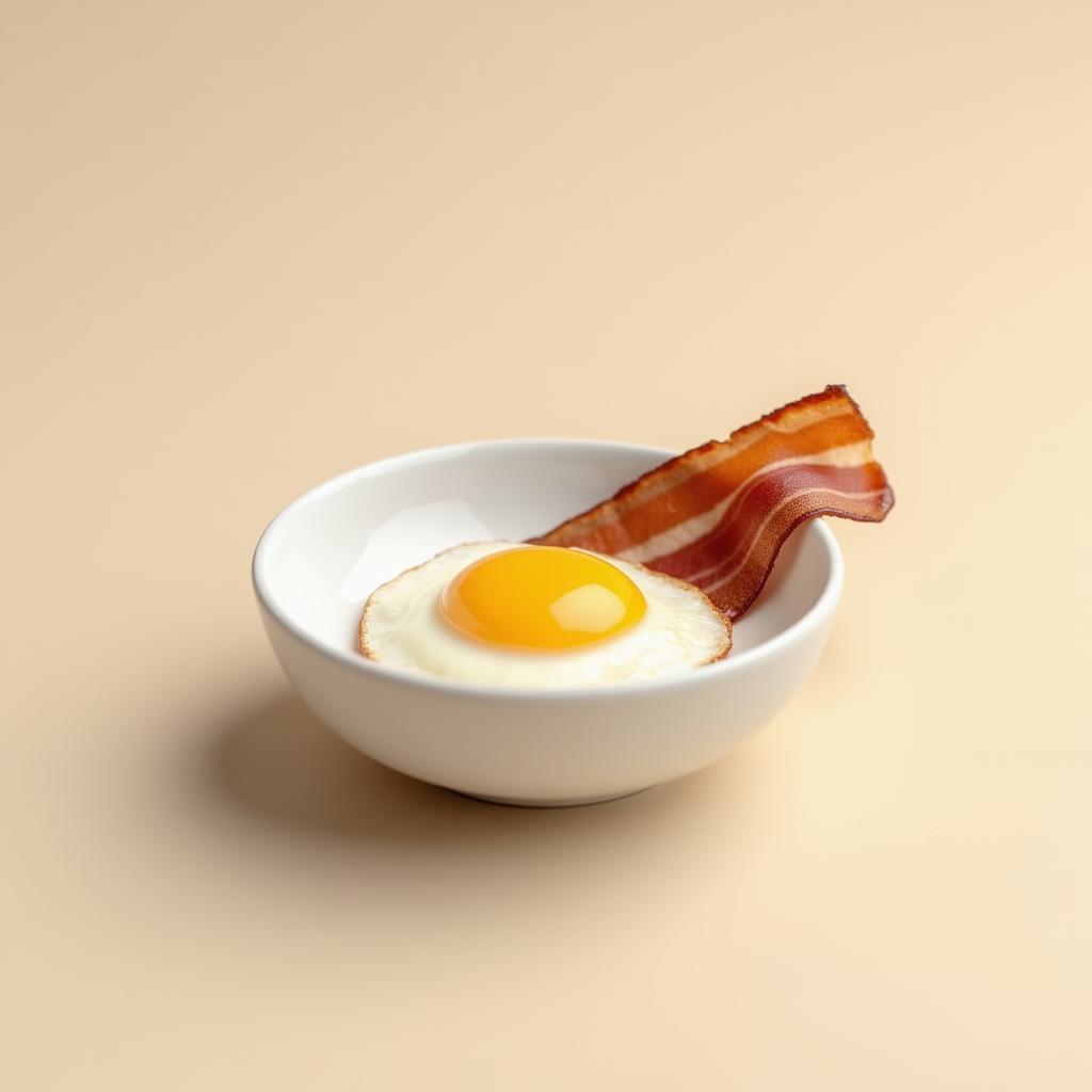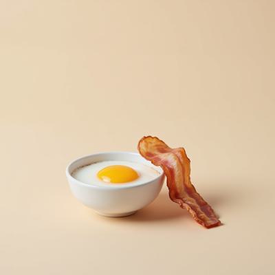 Minimalist food logo on light beige background: a simple white ceramic bowl with one perfectly fried egg and a single strip of crispy bacon leaning against it. Soft shadows, natural daylight, no text, clean composition. Style: Scandinavian food photography, muted tones, high realism, shallow depth of field.