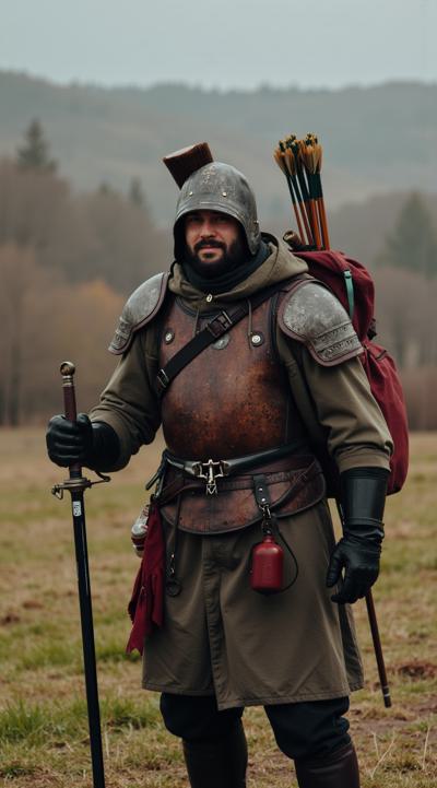Высокий худой мужчина 30 лет, бритоголовый и беритое лицо, был разведчиком русского князя, дезертир, одет в старые легкие доспехи древнего русского разведчика, за спиной колчан стрел и лук, на поясе лёгкая сабля, на поясе фляга, мешочек с золотом, за спиной походный саринный рюкзак, на шее православный крест, в руках держит богатырский шлем с изображением иконы, лицо грозное, в глазах хитрость
