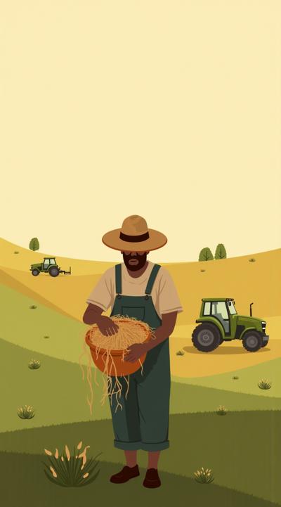 эко‑сцена: фермер девушка в купальнике и шортах бережно укладывает измельчённую солому (видимые фрагменты 3−5 см) в био‑теплице. На заднем плане стога с лоломой . Зелёные и землистые тона, мягкий свет, акцент на устойчивом сельском хозяйстве. Стиль — реализм с лёгкой идеализацией, высокое качество изображения. Акцент на измельченную солому в руках у девушке,