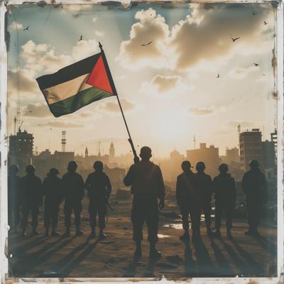 Эпичная сцена: армия арабских всадников мчится по пустыне, впереди — предводитель с поднятой рукой и флагом Палестины. За ними клубится песок, над горизонтом — дым и пепел разрушенных домов Газы, обгоревшие стены, силуэты минаретов в тумане. Солнце встаёт сквозь серо-золотую дымку, создавая контраст между разрушением и надеждой. Эмоционально, символично, без текста.,