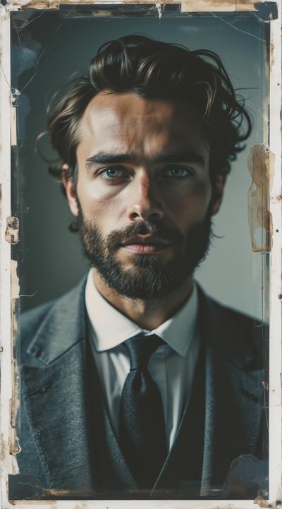 Мужчина европейской внешности,с голубыми глазами,явно словянин,в классическом костюме, красивый с бородой, выходит из тени,по всей видимости он очень важный, Он не помнит слово "да" и слово "нет", он не помнит ни чинов, ни имен., И способен дотянуться до звезд, не считая, что это сон,, И упасть, опаленным Звездой по имени Солнце..., Стоит В полный рост,на поясе кобура,в руках пистолет,на голове кепка восьмиклинка,