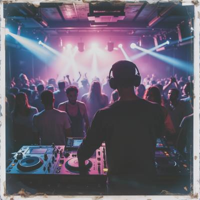 Динамичная клубная сцена с мерцающими огнями, лазерами и дымом. На переднем плане — диджей за пультом, ощущение драйва и толпы в движении. Атмосфера вечеринки, насыщенные неоновые цвета — фиолетовый, синий, розовый. Отражения света на полу, энергия, танцы, ритм. Высокое качество, реалистичная световая динамика.