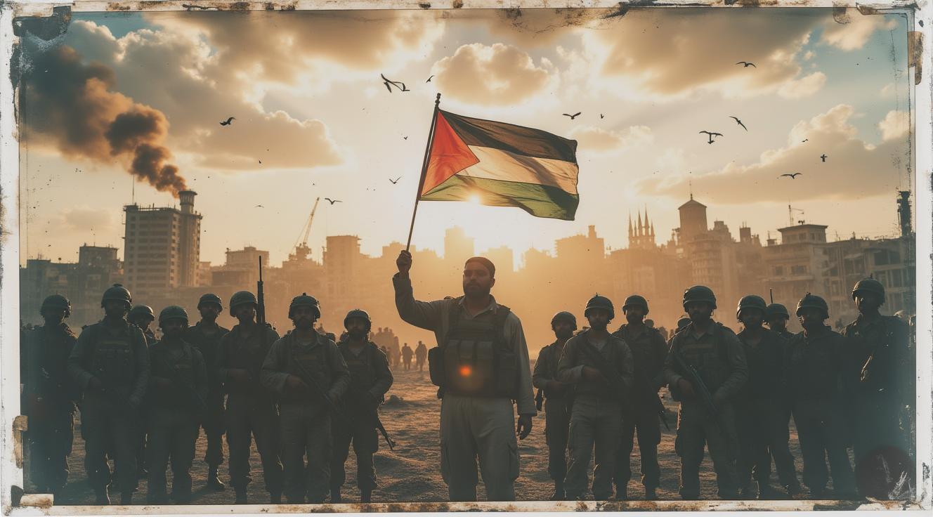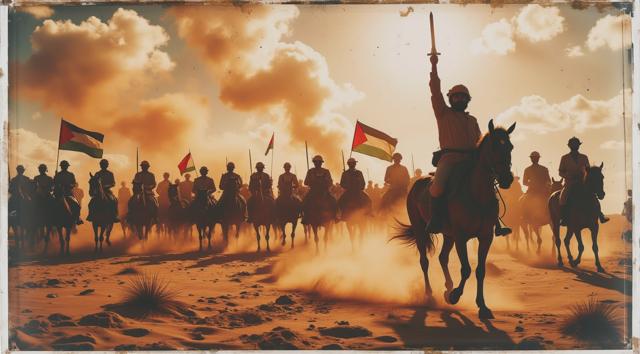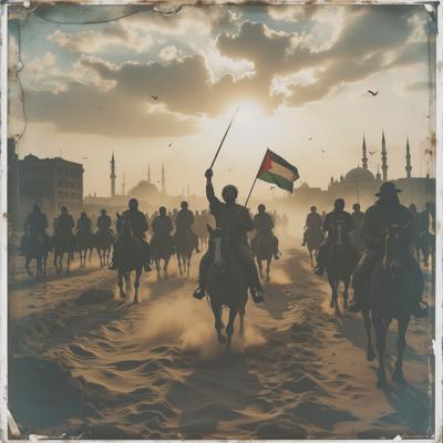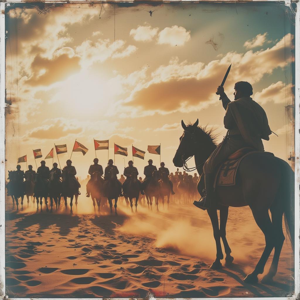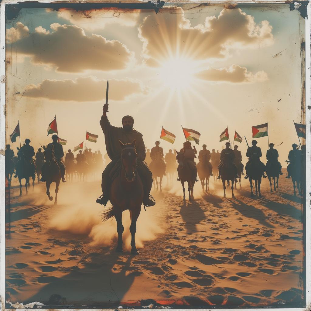 Масштабная сцена армии арабских всадников в пустыне. На переднем плане — предводитель на коне, с поднятым мечом или рукой, за ним — ряды воинов на лошадях, развевающиеся флаги Палестины над песчаным горизонтом. В воздухе клубится пыль, багряно-золотой свет рассвета пробивается сквозь неё. Атмосфера героизма, веры и единства. Без текста, кинематографично.