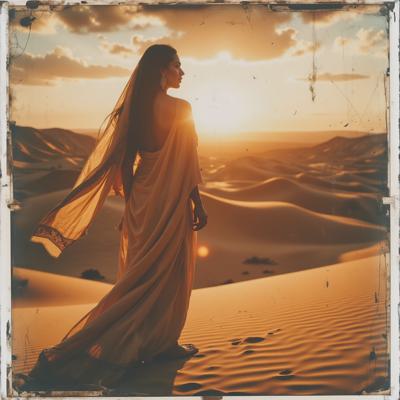 Arabic Deep House cover art, warm golden and amber palette, glowing desert dunes at sunset, a graceful Middle Eastern woman in a flowing desert robe standing by the dunes, her veil catching the warm breeze, shimmering mirage on the horizon, soft light haze, elegant arabic ornaments subtly blended into the sand, cinematic and atmospheric composition, no text.,