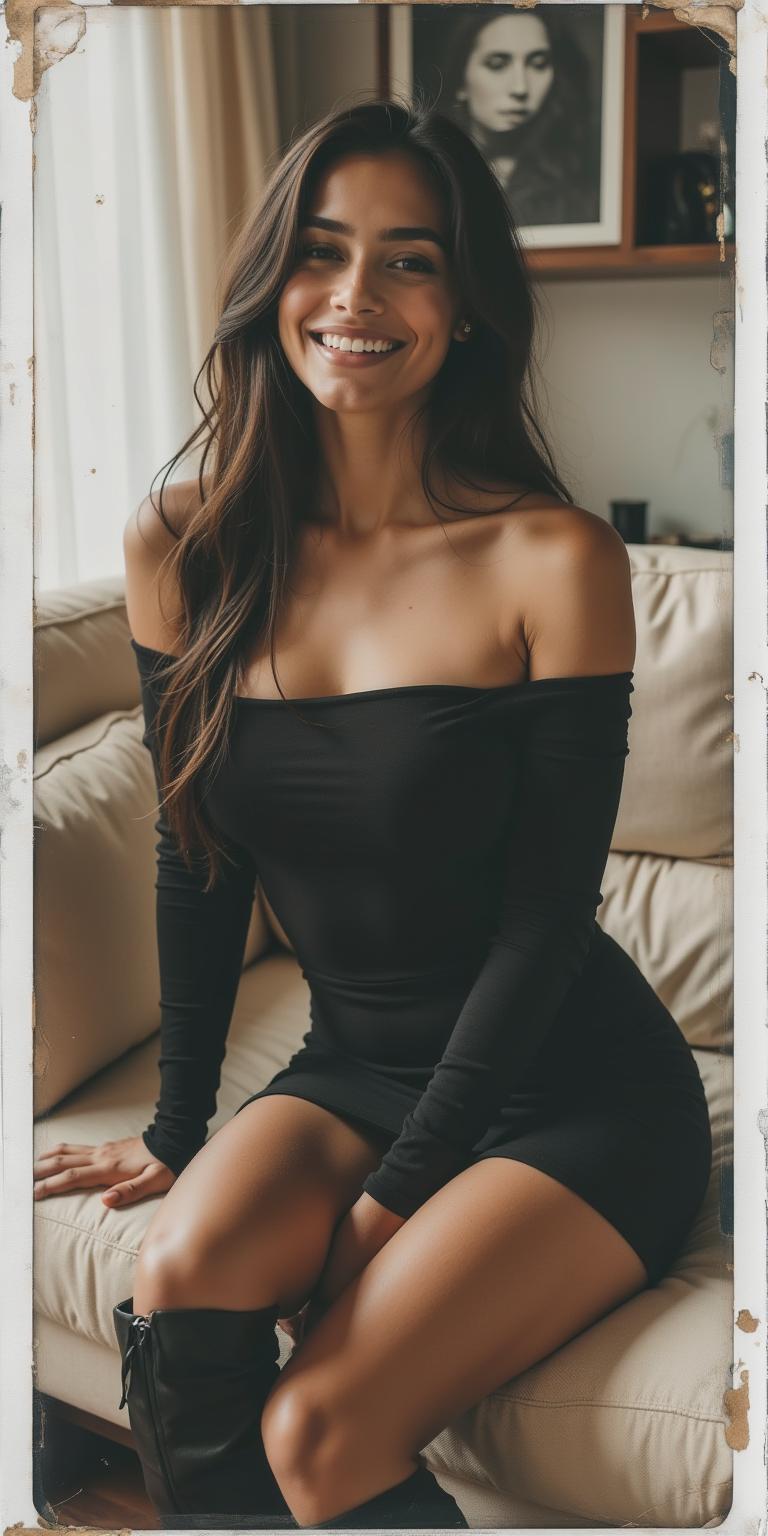 Photograph of a young woman with light olive skin and long, dark brown hair, sitting on a beige couch in a bright, modern living room. She has a slim, toned physique and is wearing an off-the-shoulder, form-fitting black dress that accentuates her curves, and black knee-high boots. She is smiling gently at the camera with a relaxed, confident posture. The background features a white wall with a minimalist framed picture and a green potted plant, adding a touch of natural color. Soft, natural light filters into the room, highlighting her features and the textures of her outfit and the couch.