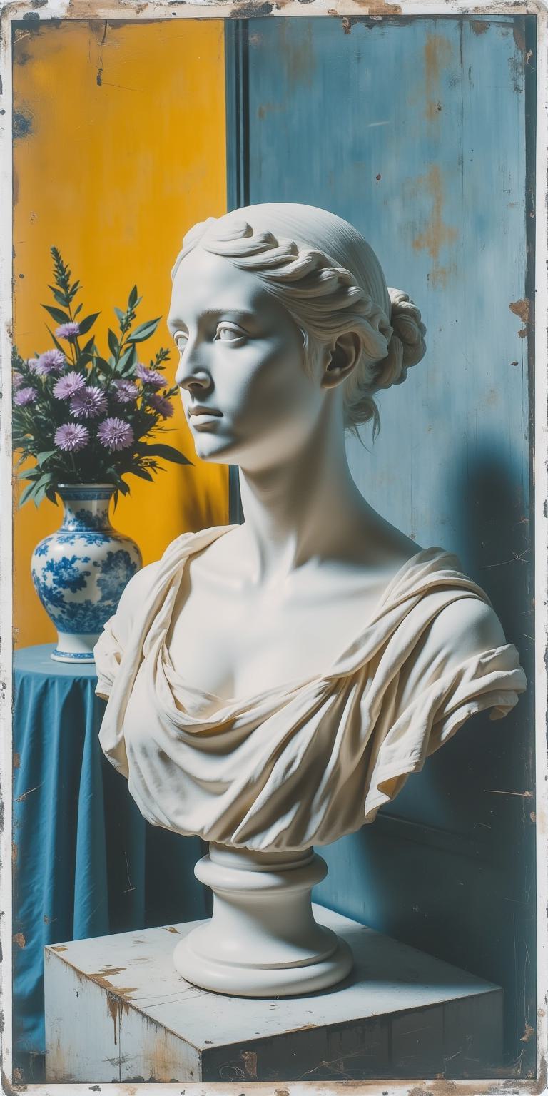 This is a photograph of a painting in a realistic style. It depicts a white marble bust of a young woman with a serene expression, her hair intricately styled. She is seated against a yellow and blue background. To her left, a blue and white vase with purple flowers sits on a blue cloth. To her right, a yellow book with a cracked seashell on top rests on the same blue cloth. The background includes a mix of yellow, blue, and white, creating a vibrant yet serene atmosphere. The textures are smooth with visible brushstrokes, adding depth to the composition.,