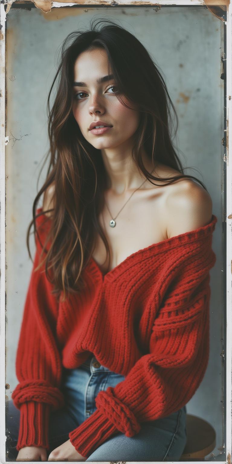 This is a photograph of a young woman with fair skin and long, straight dark brown hair with subtle highlights. She is sitting on a wooden stool against a plain gray background. She is wearing a red, chunky-knit, off-the-shoulder sweater, which reveals her right shoulder and collarbone. She is not wearing pants, exposing her bare legs and feet, which are crossed at the ankles. Her right hand is raised to her mouth, with her index finger gently touching her lips, giving a contemplative or slightly seductive expression. Her eyes are dark and focused directly at the camera. The lighting is soft, highlighting her smooth skin and the texture of her sweater.