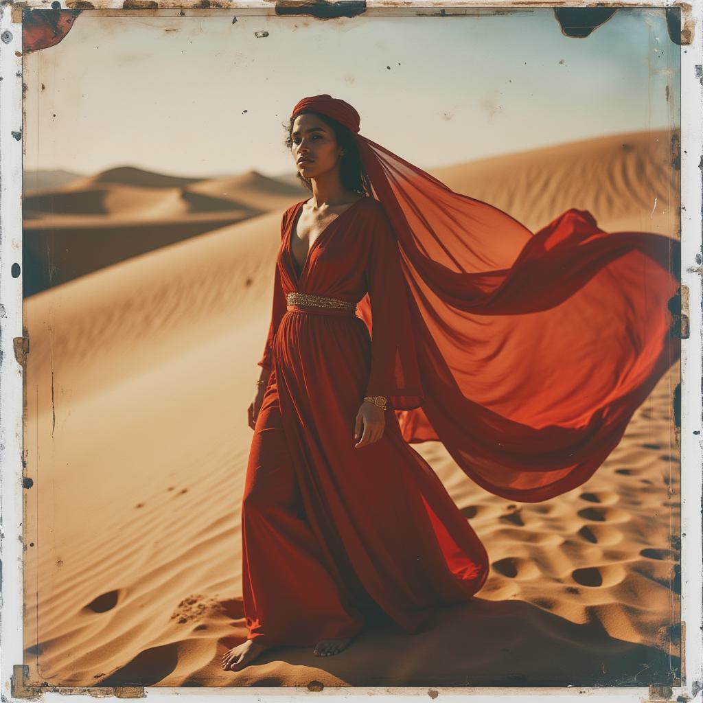 Арабская девушка на бархане в бархатном красно шелковом платье **Sunset Desert**. Тёплый золотой свет, лёгкая вуаль, ветер тянет ткань. Глубокие восточные краски: песочный, золотой, тёмно-синий. Мягкая дымка, кинематографичность, боке. Акцент на взгляде и фактуре ткани. Атмосфера тайны и ритуала. Стиль modern Arabic aesthetics, deep house mood, high detail, high contrast.