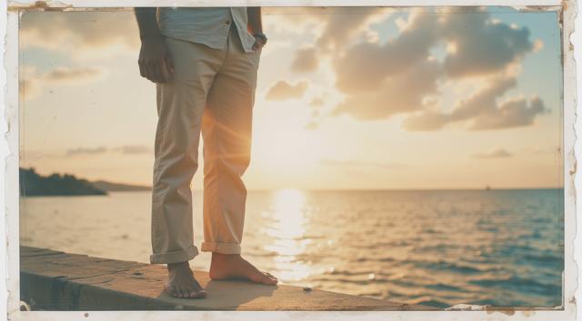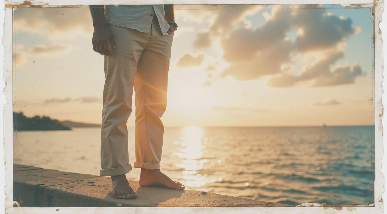 ноги слегка выглядывают из кадра в сетчатых сланцах. Он босиком, смотрит вдаль на закат. На нём лёгкая летняя одежда — бежевая тонкая рубашка и светлые льняные брюки, слегка колышется на ветру. Спокойное море на заднем плане, отражение неба в воде. Мягкий золотистый свет заката, атмосфера уюта, свободы и внутреннего покоя. Реалистичный стиль, кинематографическое освещение, мягкий фокус, лёгкое боке. Тёплые тона, надпись «Чилл» минималистичная, гармонично вписанная, без ярких цветов. пальма чуть свисает с верху