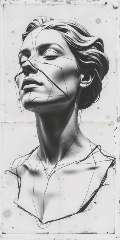 , Черно-белая экспрессивная линейная графика с фрагментированной скульптурой женского бюста, концептуальный рисунок в стиле современного искусства, четкие контурные линии, минимум деталей, без растушевки, без градиентов, без текстурного шума, элегантное негативное пространство, эмоциональная композиция, нарушенная анатомия, выраженная простыми четкими контурами, эстетика плаката для галереи, изысканный минимализм, художественная иллюстрация, чистые черные чернила на белом фоне
