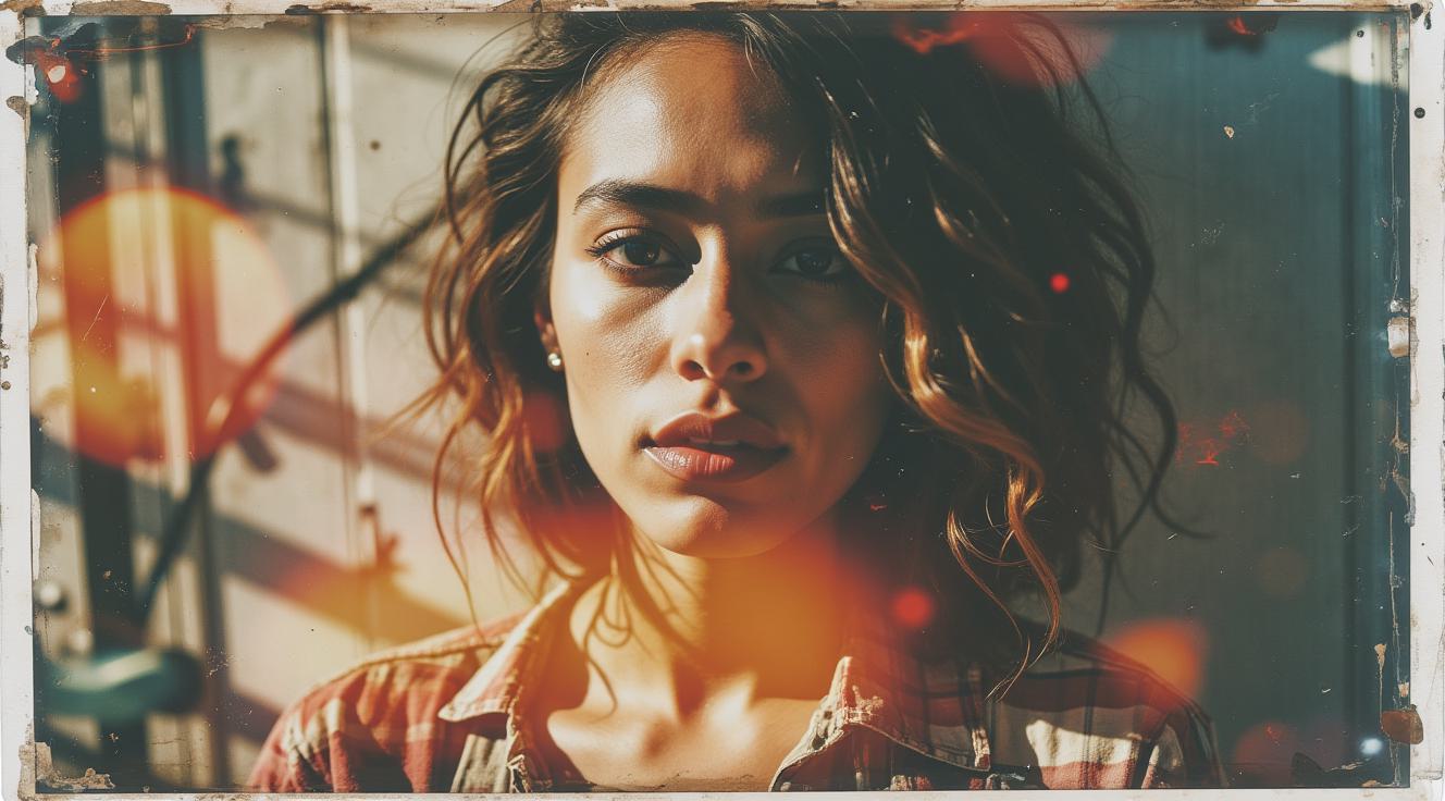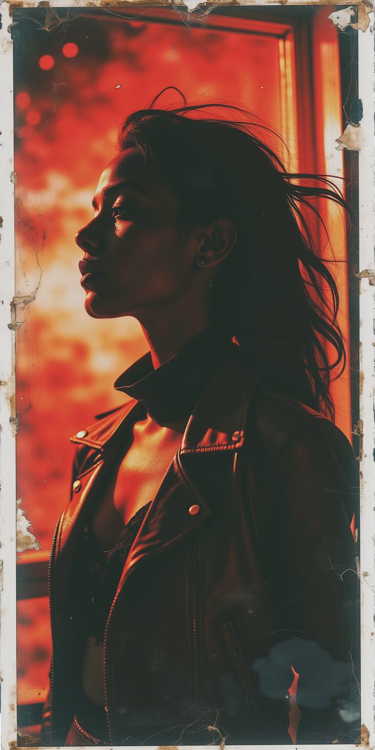 The image is a portrait of a young woman with shoulder-length brunette hair styled in loose waves. She is wearing a red blouse with a deep V-neckline and a black skirt. She has a gold necklace and earrings, and her makeup is done in a bold red lipstick. The woman is posing with one hand on her hip and the other resting on her thigh. The background is blurred, but it appears to be an indoor setting with a cityscape visible in the distance. The overall mood of the image is elegant and sophisticated.,
