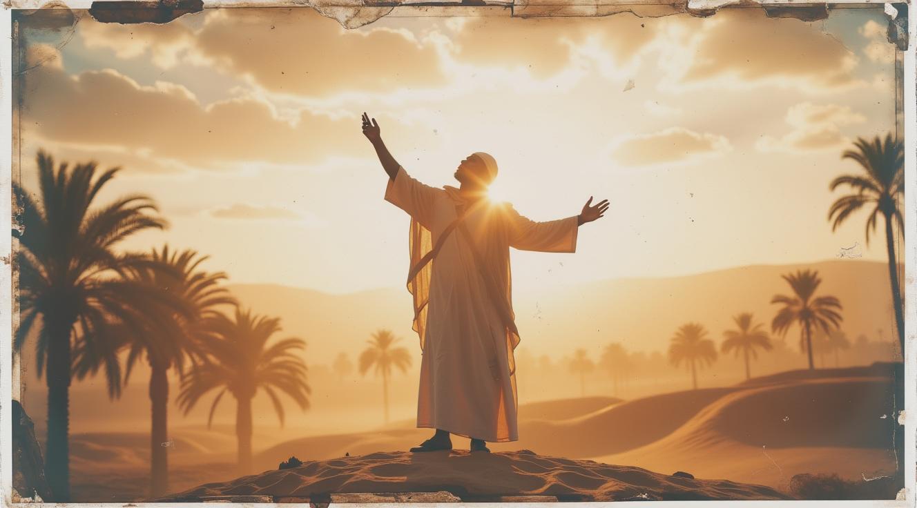 духовная атмосфера исламского нашида, вечерний пустынный пейзаж с мягким золотистым светом, мужчина в традиционной арабской одежде стоит на песке с поднятыми руками к небу, вокруг — лёгкая дымка и силуэты пальм, акцент на ощущении смирения и благоговения, стиль реалистичный, мягкий фокус, тёплая колористика, 1:1