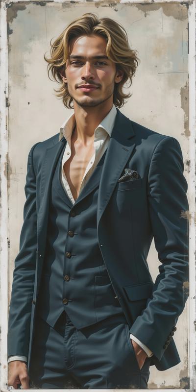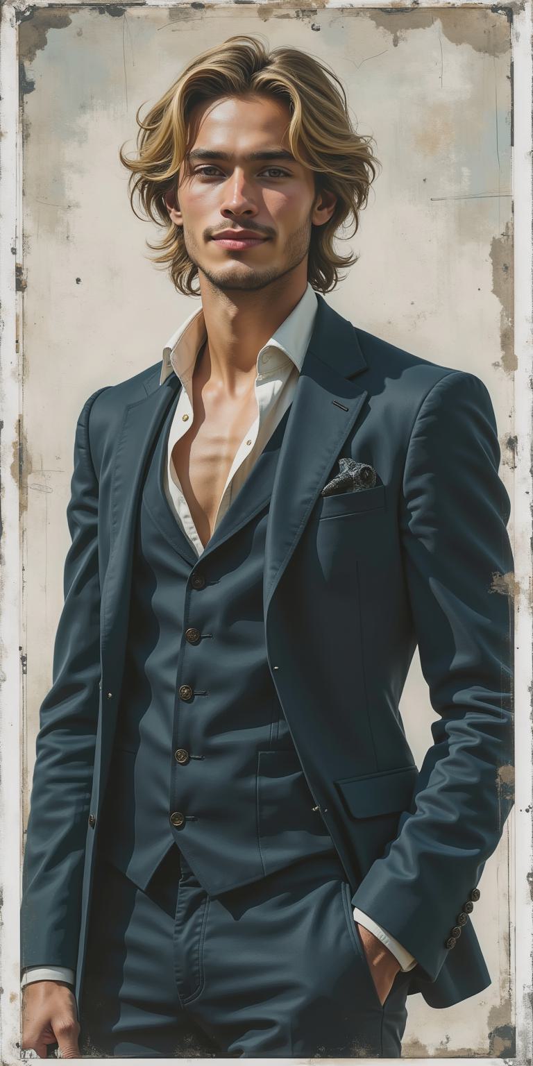 молодой аристократ из фэнтези‑романа: высокий, стройный блондин с волнистыми волосами до плеч, серо‑голубыми глазами и доброжелательной улыбкой. Одет в тёмно‑синий костюм, подчёркивающий осанку. Стиль: реалистичная цифровая живопись, мягкое освещение, нейтральный фон. Детализация: высокая, с акцентом на текстуру кожи и волос
