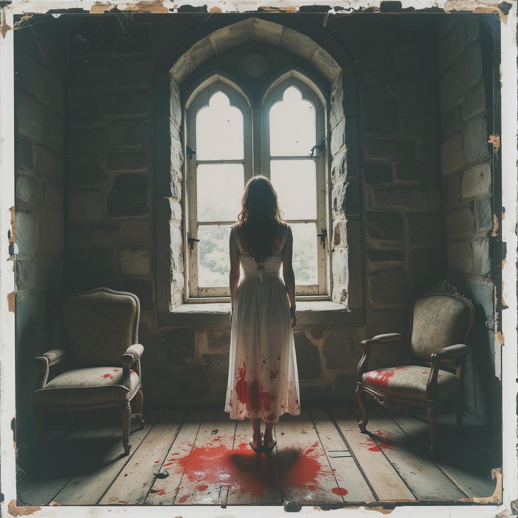 Medieval setting. A beautiful hall of a castle made of black stone, furnished with furniture. A woman stands at the window sill with her back to us. We can only see her back, wearing a white nightgown with red paint splatters at the bottom. We see her brown hair and bare feet with red splatters. She stands by the window. The sky and clouds are visible outside. It's morning, with sun rays streaming into the hall.