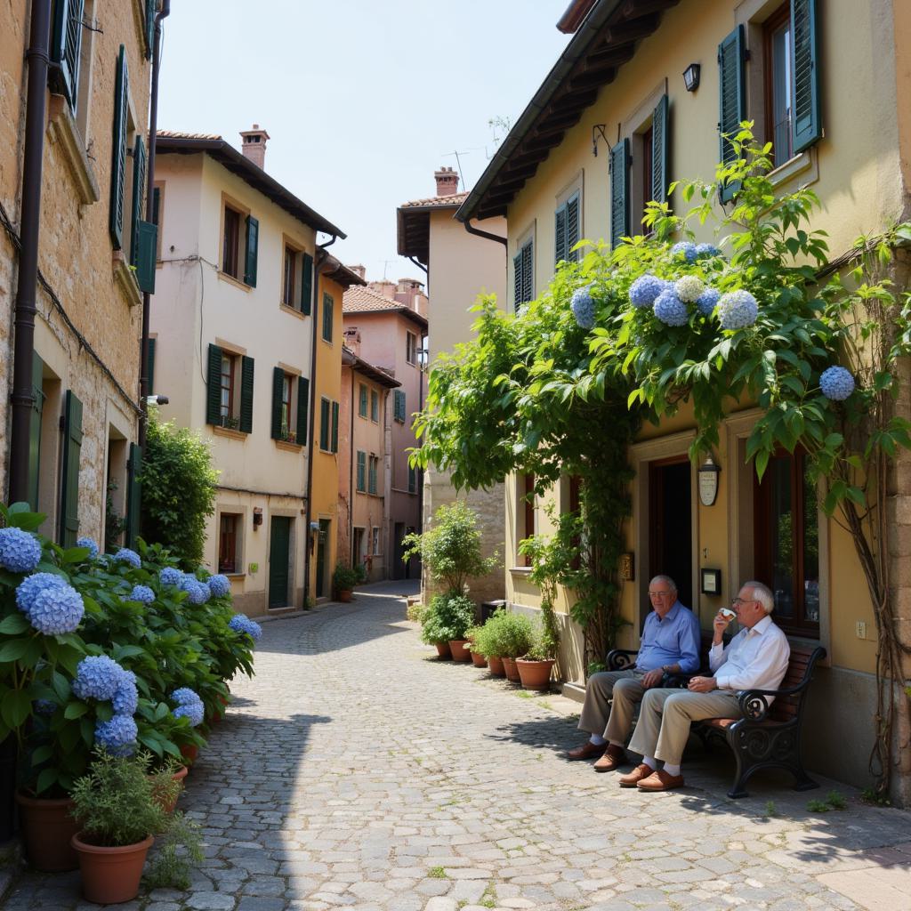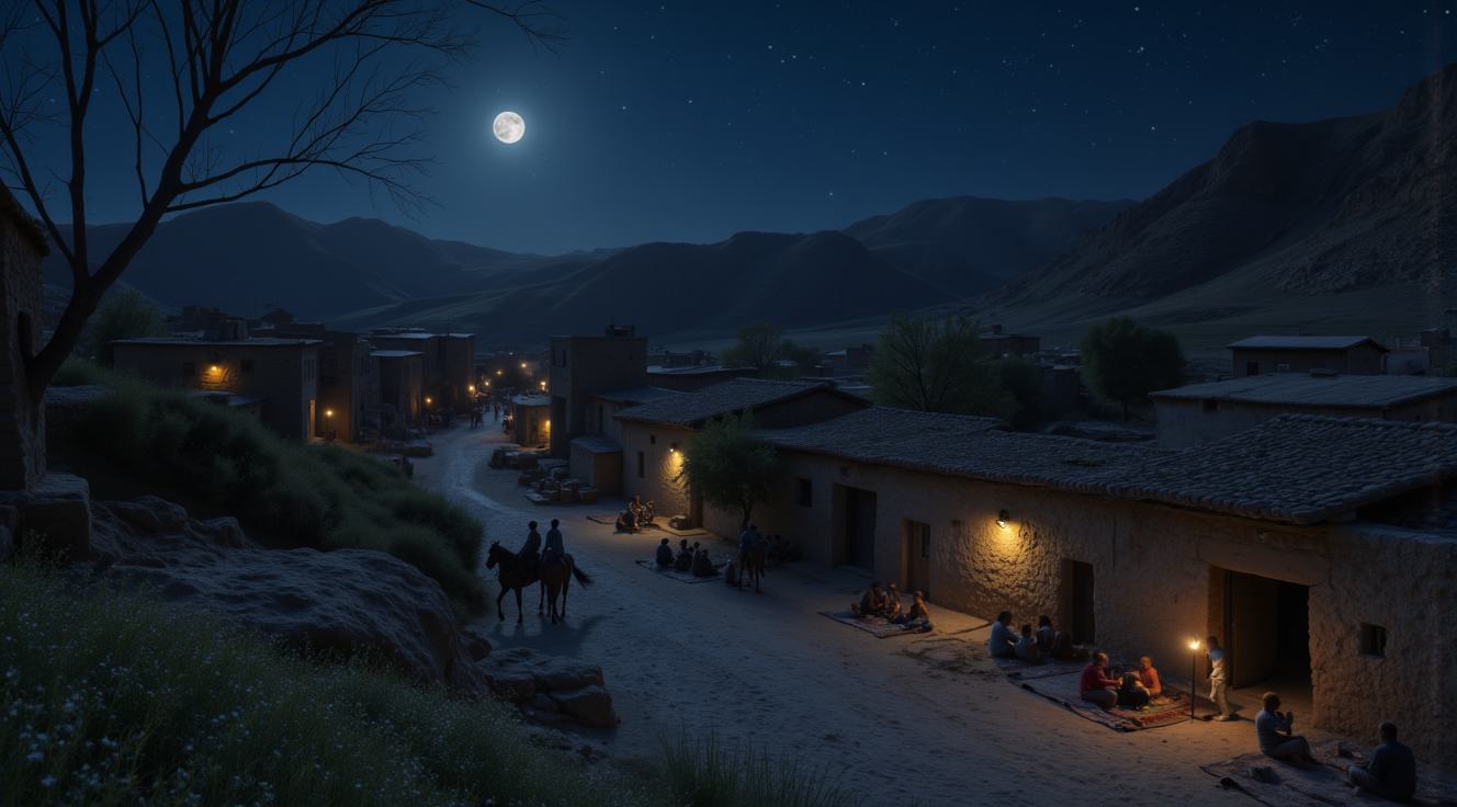 ночь, лунный свет, полнолуние, освещение факелами, маленькое античное поселение, здания низкой постройки, протоптанная дорога, деревья, полевые цветы, многоуровневый ландшафт, на улице гуляют люди, сидят на коврах, едят пьют напитки, стражники проезжают по улице на лошадях, простая спокойная жизнь, вид с верху, вид с балкона высокого здания, высокая детализация, большое открытое пространство, мост через канал, поводе плывут лодки с людьми не них, динамика, рисунок маслом, ренессанс, эпоха возрождения