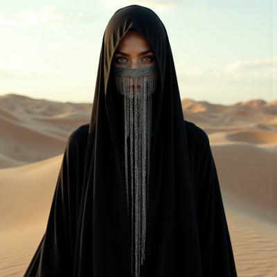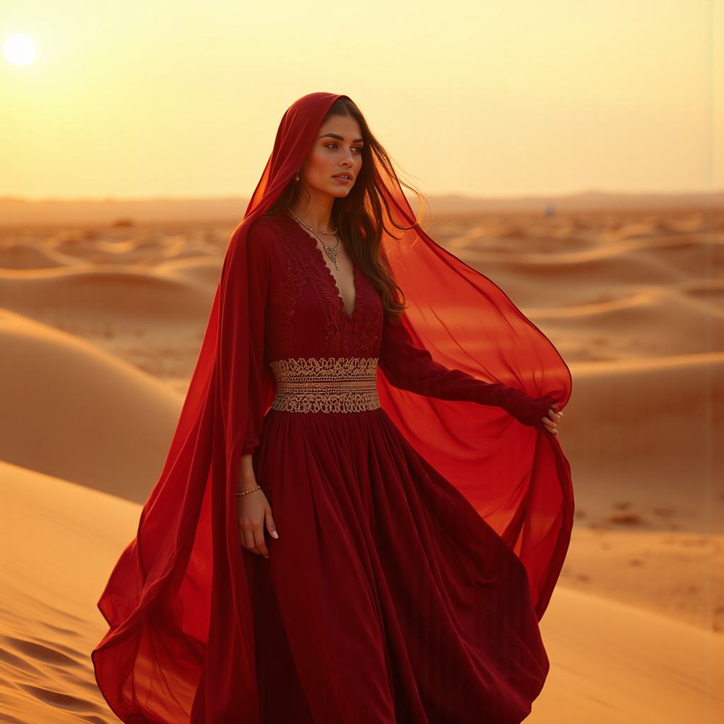 Арабская девушка на бархане в бархатном красно шелковом платье **Sunset Desert**. Тёплый золотой свет, лёгкая вуаль, ветер тянет ткань. Глубокие восточные краски: песочный, золотой, тёмно-синий. Мягкая дымка, кинематографичность, боке. Акцент на взгляде и фактуре ткани. Атмосфера тайны и ритуала. Стиль modern Arabic aesthetics, deep house mood, high detail, high contrast.