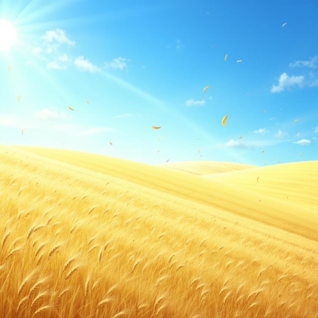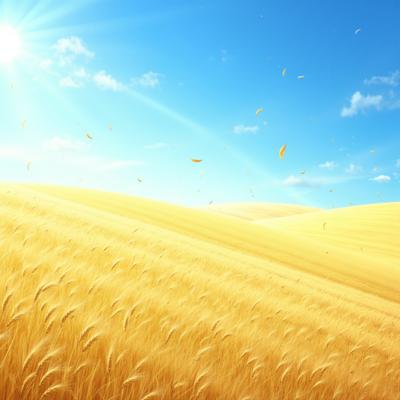 Золотистое поле ржи, колышущееся на ветру., Яркое, жаркое солнце, заливающее пейзаж светом., Голубое, бездонное небо., Возможно, легкие облака., Ощущение тишины и покоя., Детали: отдельные колосья, травы, насекомые (опционально, для оживления)., Стиль: Реалистичный, с элементами импрессионизма в передаче света и цвета.