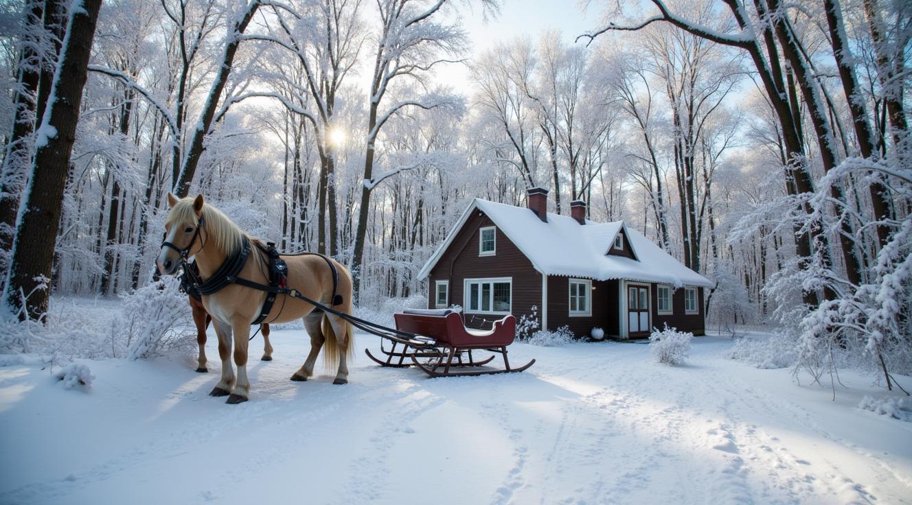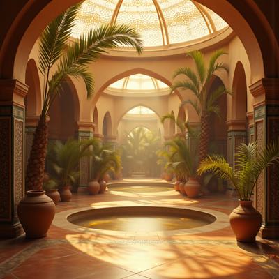 Зимний сад в стиле Arabic Deep House. Сквозь стеклянный купол льётся тёплый золотистый свет, контрастируя с холодной дымкой за окнами. Внутри — пальмы, глиняные вазы, узорчатые арки, мозаичные плитки. Лёгкое свечение, мягкие тени, песочные и охристые оттенки. Туман, спокойствие, ощущение далёкого восточного уюта среди зимы.