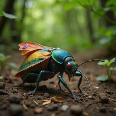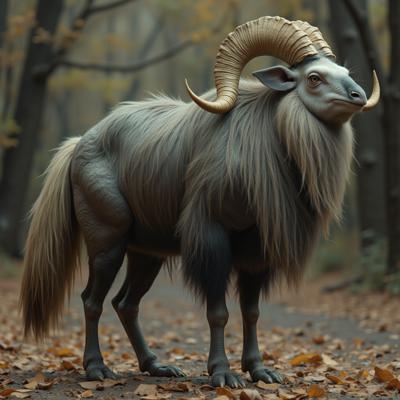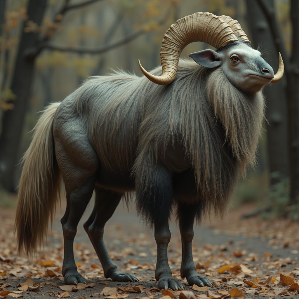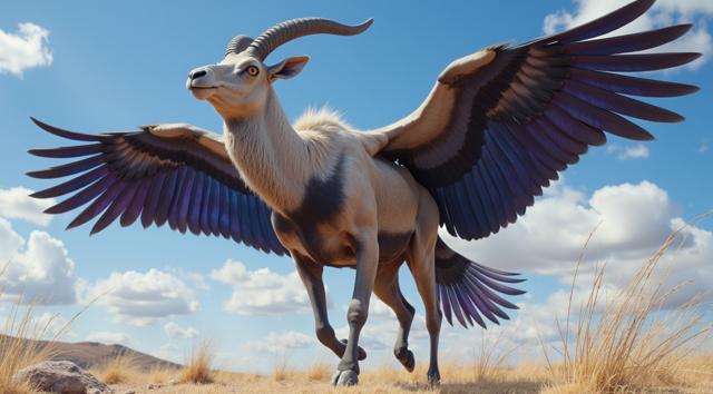 "Крылатое непарнокопытное: с уникальными чертами, мощное телосложение, шерсть цвета выветренного камня с темными полосами, глаза янтарные, небольшие костяные выросты. Крылья - пернатые, как у аиста, но у основания с перьями, цвета от темно-синего до фиолетового, переливающиеся разводы. Летит в горной местности на закате. Стиль: реалистичный, стилизованный, высокая детализация, передать силу, мудрость и древнюю магию."