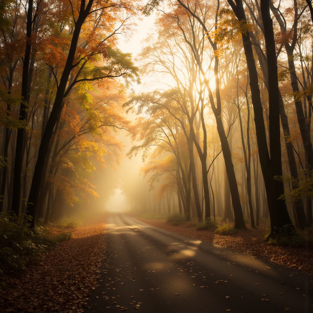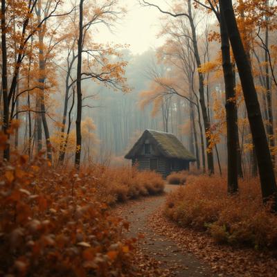 Осенний лесной пейзаж с глубокой перспективой, профессиональное реалистичное фото, на переднем плане осенние кусты, ветви и листья близко к камере. Передний план чуть-чуть размыт. Средний план в фокусе, на среднем плане осенние деревья. В глубине леса в тумане виднеется уютная лесная избушка. Солнечные лучи пробиваются сквозь туман. Гиперреализм, суперреалистичное фото